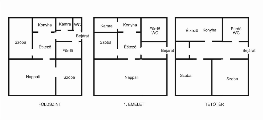 - Szintek: 3 különálló lakrész, zárt lépcsőházból megközelíthetően